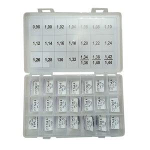 Set of adjustment shims, Ø = 4.4 x 7.7 mm, H = 0.98-1.44 mm, Step = 0.02 mm, 24 sizes.