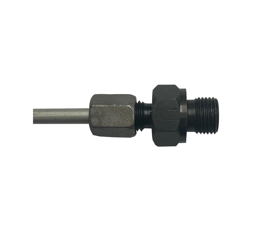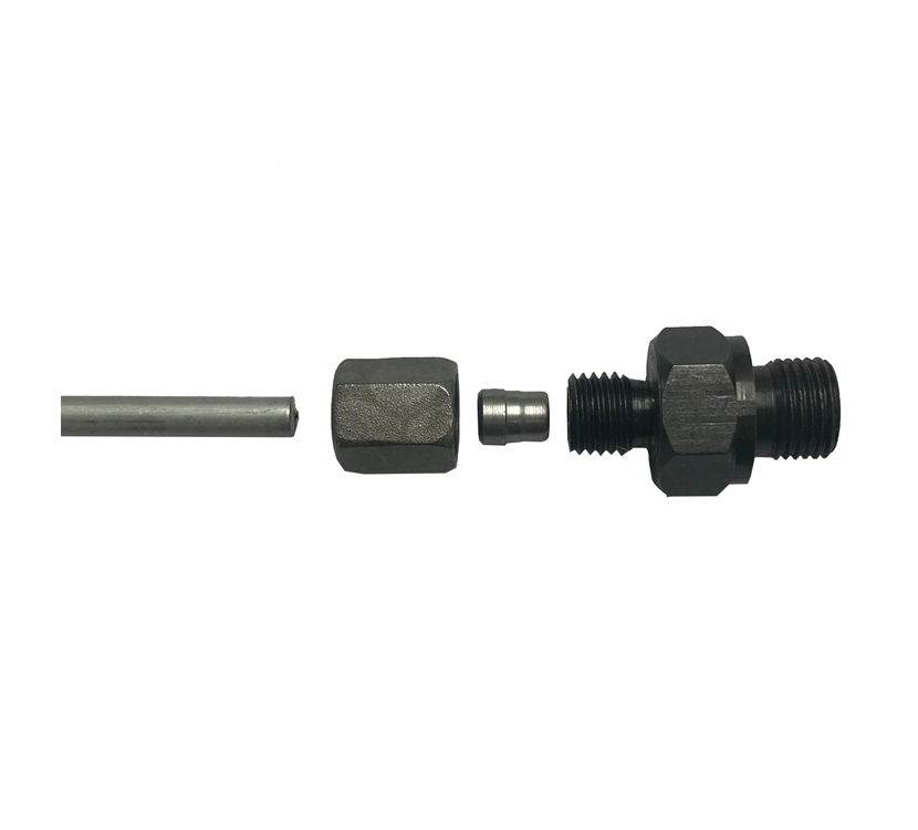 The fitting is connected to the circuit via its external G1/8″ thread, with sealing provided by the rubber O-ring DL-27-012800. The other side of the fitting features an external M8x1 thread for connection to a Ø4mm metal tube. It has a groove (cone) for the shut-off sleeve DL-24-SLL-04, and when a metal tube is installed, the working pressure can reach up to 40 bar.