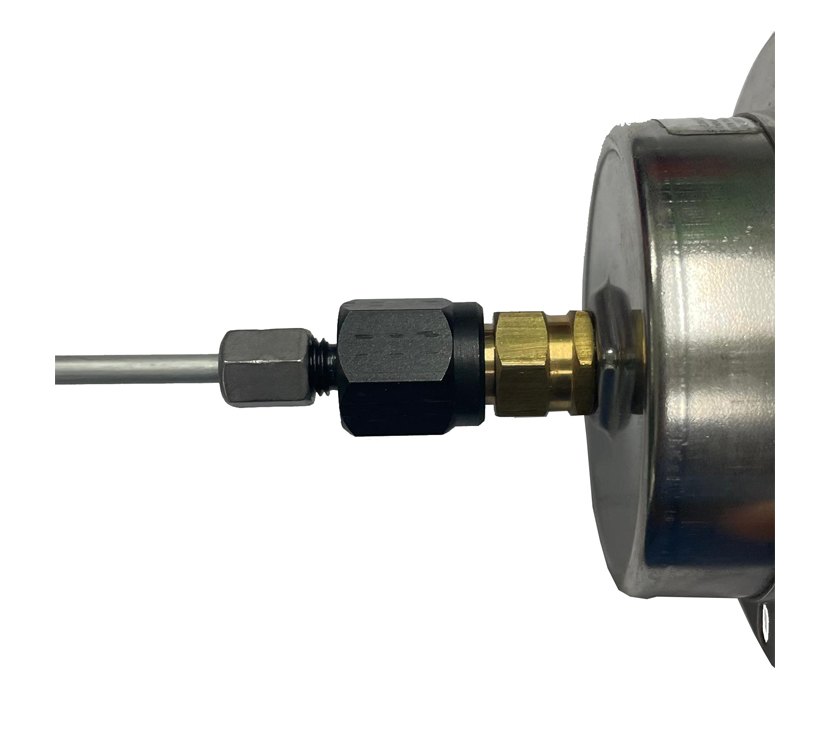 The fitting has an internal G1/4″ thread for connection to a gauge with the same thread, and an external (male) M8x1 thread. On the M8x1 side, there is an internal groove for the shut-off sleeve DL-24-SLL-04 and a Ø4mm port for connection to a Ø4mm metal tube. When a metal tube is installed, the system’s working pressure can be up to 1000 bar.
