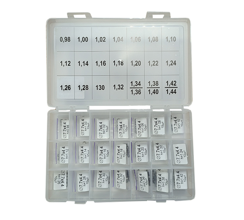 DL22CR-222. Set of adjustment shims, Ø = 4.4 x 7.7 mm, H = 0.98-1.44 mm, Step = 0.02 mm, 24 sizes.