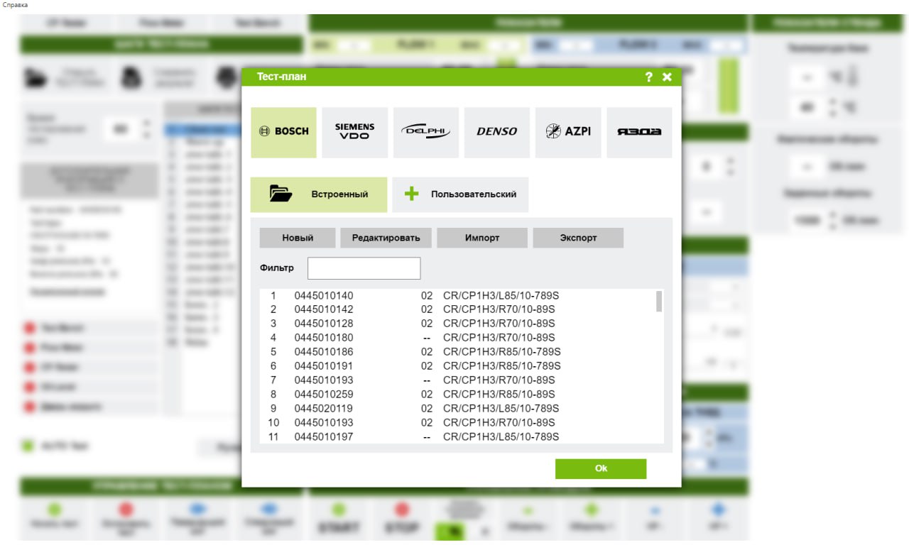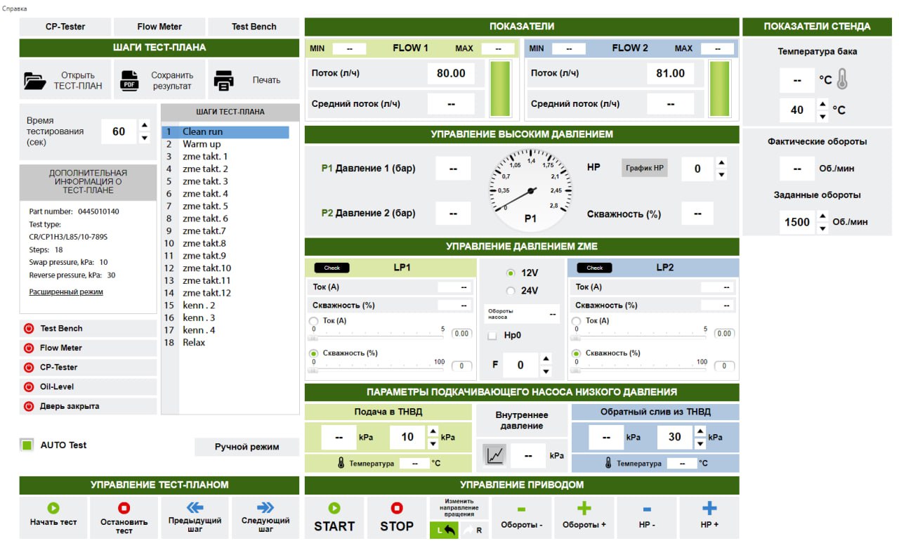 Checking of pumps is carried out both using test plans built in the program, and with the possibility of creating their test plans and controlling pumps in manual mode.