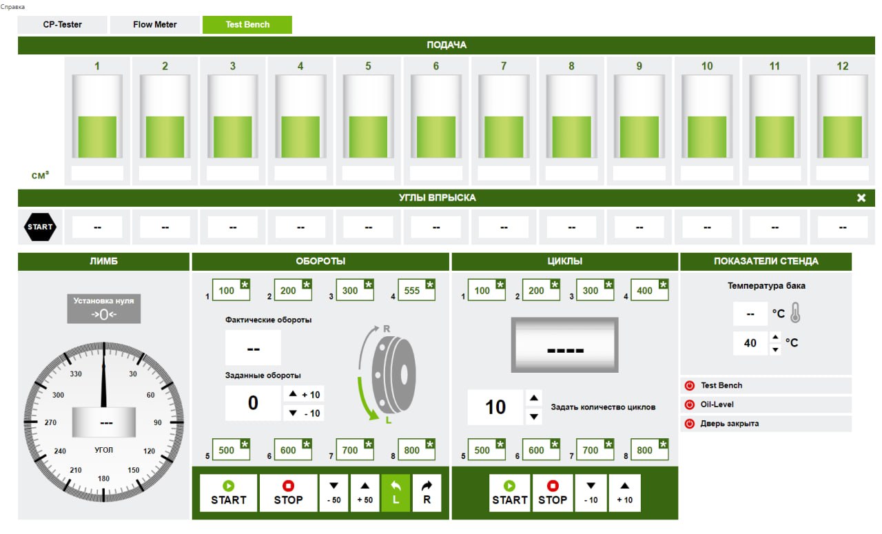 To test CP pumps with the PTC-2520 controller, is needed a test bench with a power of 7.5 kW or more (for example SPF-708), various pump attachment devices and a pressure accumulator (rail) with pressure regulators (1 to 3 pcs.). To check the performance of the CP pumps, a backflow is measured after the pressure regulators using a flow meter ( FMDE-1200, FMDE-1520).